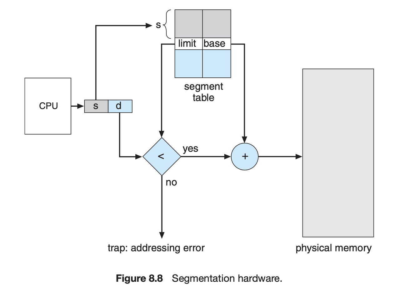 MMU는 세그먼트 테이블로 CPU에서 할당해준 논리 주소에 해당하는 물리 주소의 위치를 가지고 있고, 이 방법을 통해서 CPU는 프로세스가 연속된 메모리 공간에 위치해 있다고 착각을 하게 되죠.